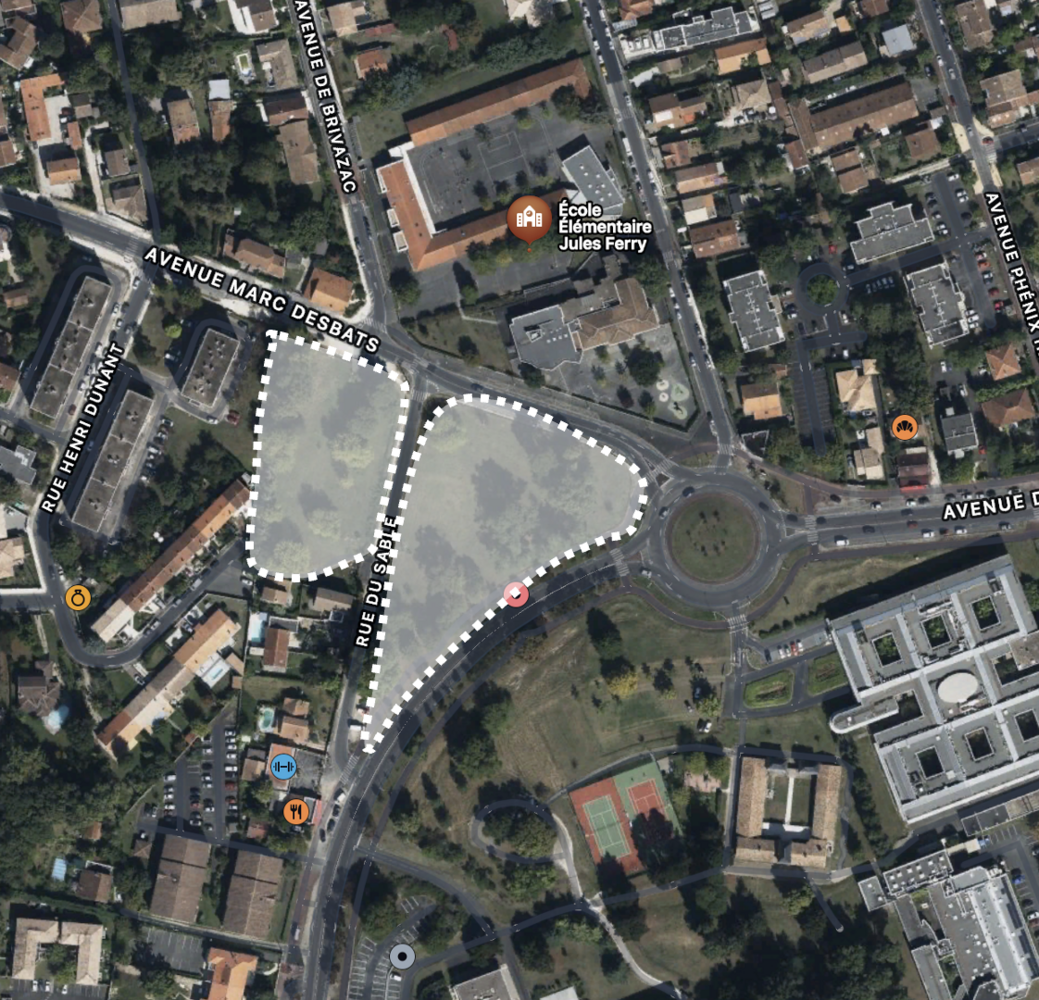 Description du projet : Le projet consiste à aménager une aire de jeux, un espace de détente et de pause repas au sein d’un terrain arboré vacant, peu utilisé et non mis en valeur à ce jour. L’espace concerné serait l’une des deux parcelles (cf plan ci-dessous) situées face à l’École Jules Ferry, entre l’Avenue Marc Desbats et l’Avenue du Dr Schweitzer. Il est à proximité de plusieurs points de restauration rapide et accolé au campus. Le projet est d’installer une petite zone d’aire de jeux pour enfants, quelques tables de pique-nique et des bancs tout en préservant la verdure, les haies et arbres existants. En fonction des possibilités sur le plan foncier, l’aménagement pourrait avoir lieu sur une portion limitée des terrains disponibles, par exemple le long de la Rue des Sables.