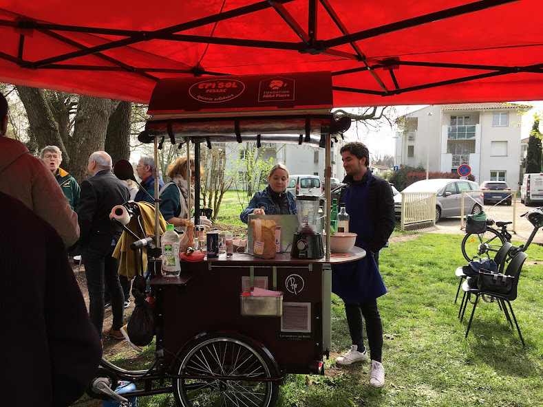 Suite à l'investissement du Vélo cargo en 2021, nous réalisons de la cuisine de rue dans les différents quartiers de Pessac, en partenariat avec diverses associations, comités de quartiers, centres sociaux...En plus de l'entretien du frigo solidaire au centre ville, des repas gratuits ou avec une participation solidaire, nous animons des ateliers jardin au Jardin du bois des roses, et d'autres encore autour de la couture notamment.