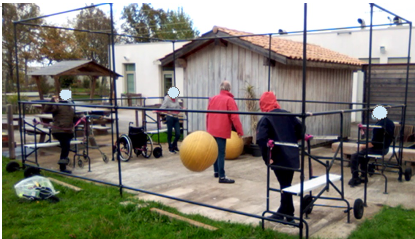 Objectif : Implanter un mini stade permettant à des personnes non marcheuses et marcheuses précaires de jouer au ballon, au tennis, au hockey, au basket et au volley debout avec d’autres personnes.