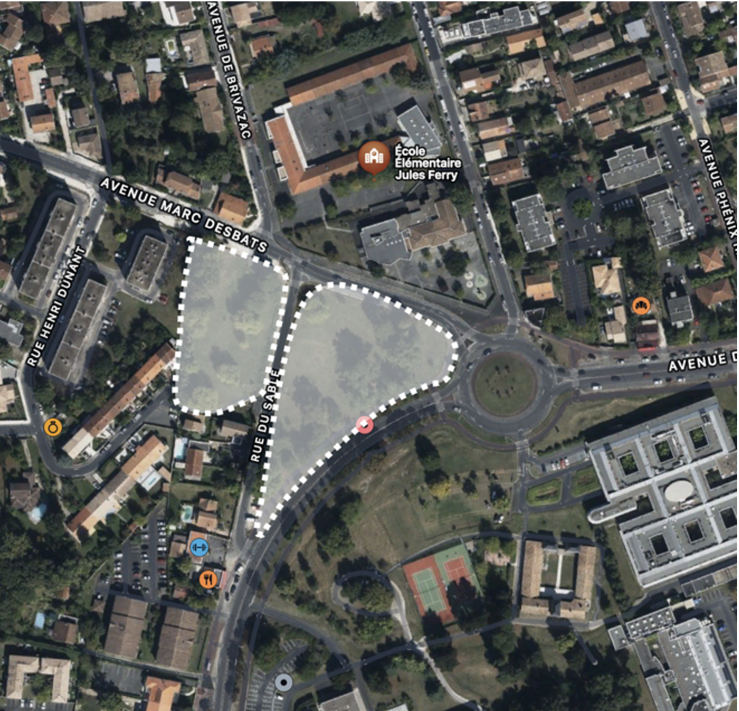 Le projet consiste à aménager une aire de jeux, un espace de détente et de pause repas au sein d’un terrain arboré vacant, peu utilisé et non mis en valeur à ce jour. L’espace concerné serait l’une des deux parcelles (cf plan ci-dessous) situées face à l’École Jules Ferry, entre l’Avenue Marc Desbats et l’Avenue du Dr Schweitzer. Il est à proximité de plusieurs points de restauration rapide et accolé au campus. Le projet est d’installer une petite zone d’aire de jeux pour enfants, une table de ping-pong extérieur pour les plus grands qui remplacerait celle de la salle de quartier qui est vétuste, quelques tables de pique-nique et des bancs tout en préservant la verdure, les haies et arbres existants. En fonction des possibilités sur le plan foncier, l’aménagement pourrait avoir lieu sur une portion limitée des terrains disponibles, par exemple le long de la Rue des Sables. Ce projet est proposé par le Comité de Quartier Brivazac Candau.