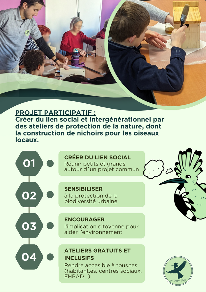- L'association La Huppe Verte, engagée pour la protection de la nature depuis 2022 sur le territoire girondin propose un projet novateur : (re)créer du lien social et intergénérationnel et accessible à tous.tes en permettant aux habitant.es de se retrouver autour d'une activité manuelle, ludique et adaptée tout en participant à la protection de la biodiversité. Au programme : 🛠️ Fabrication de nichoirs adaptés aux oiseaux locaux 🌍 Sensibilisation à la biodiversité urbaine et à l’importance des refuges pour la faune 👨👩👧👦 Création de lien social en réunissant petits et grands autour d’un projet commun Ces nichoirs seront ensuite installés dans des espaces publics pour contribuer à la préservation des oiseaux en ville et permettre à chacun d’en observer l’utilité au fil des saisons. Ces ateliers pourront être proposés gratuitement aux habitant.es dans le quartier lors de temps de rencontre, mais aussi aux centres sociaux, EHPAD et maison de retraite, afin de favoriser au maximum l'accès à la découverte et protection de la biodiversité.